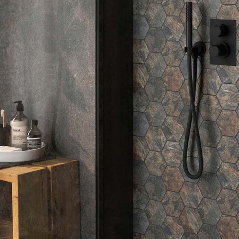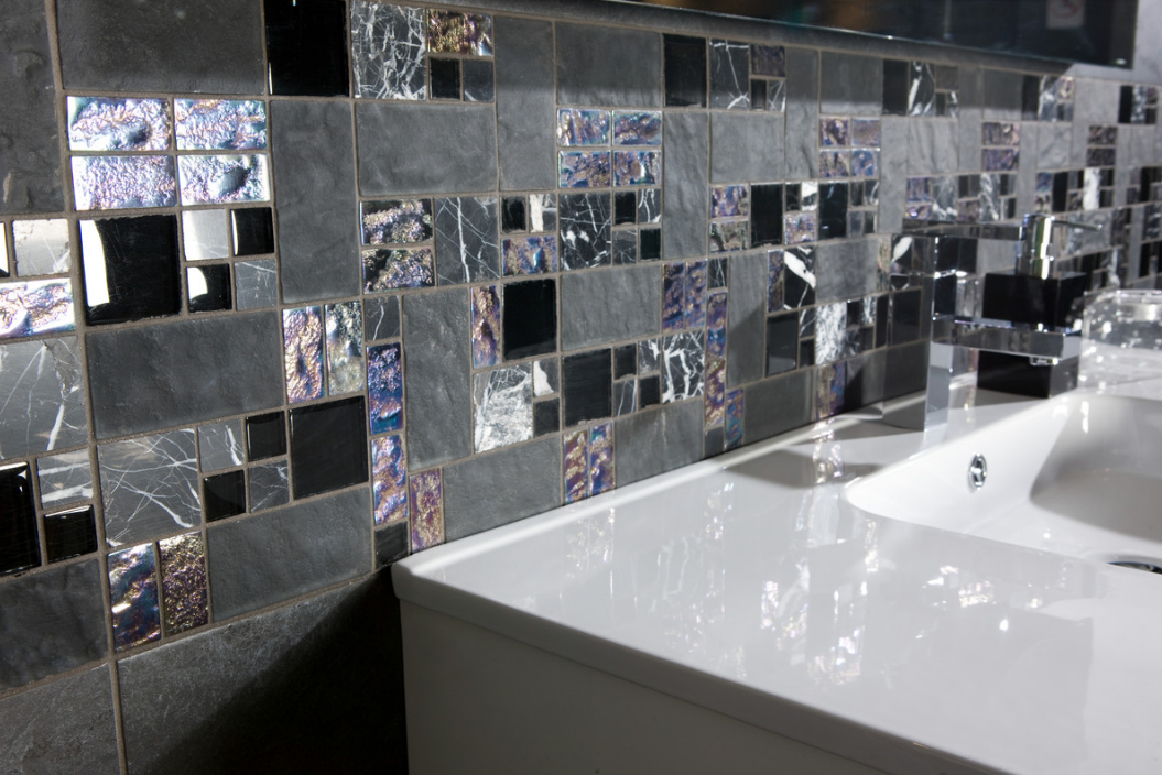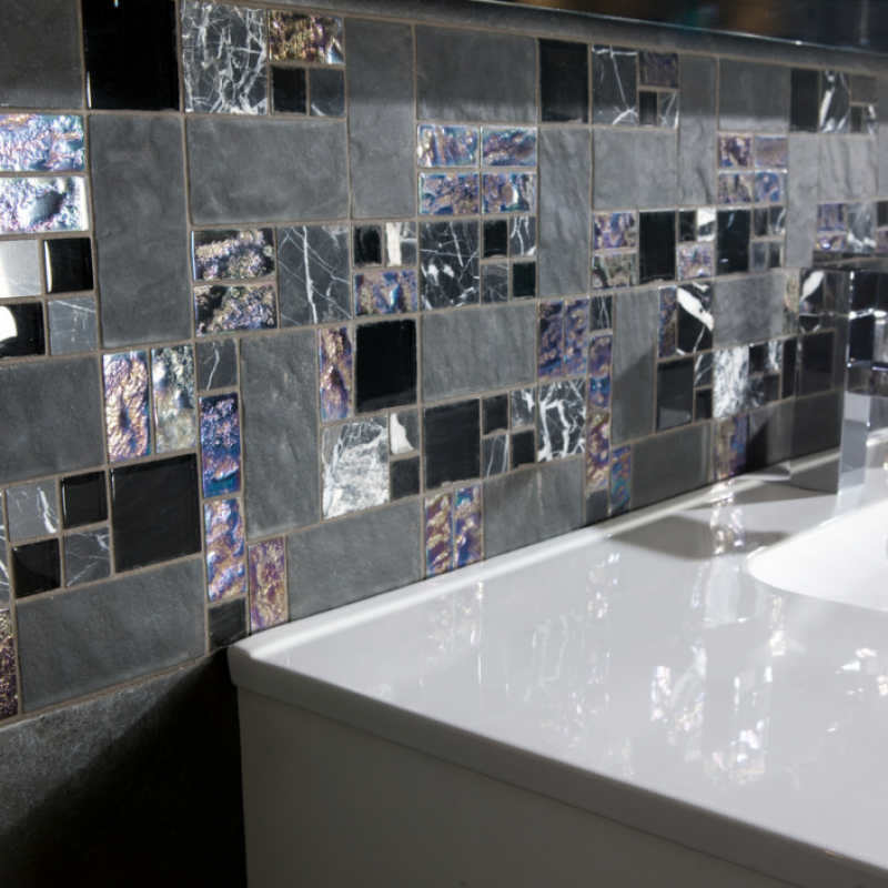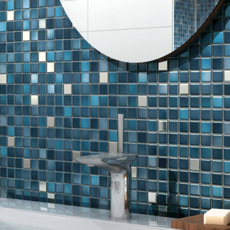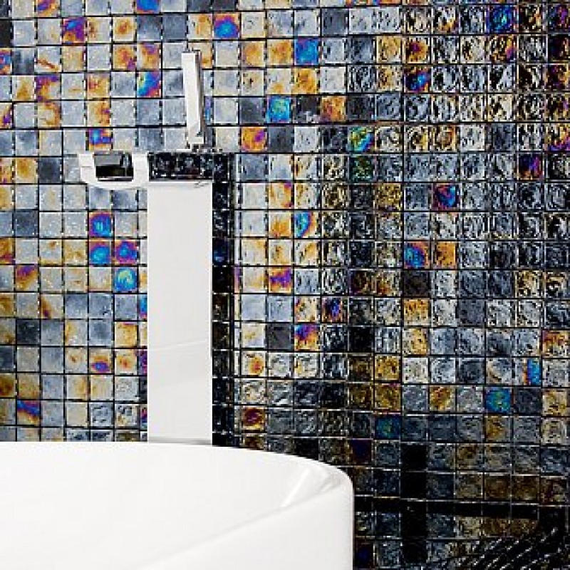 DUNIN FAT CUBE to z pozoru klasyczna mozaika jednak efekt rozlanej benzyny zauroczy każdego, kto chce wyróżnić się ze swoją łazienką w oryginalny sposób.