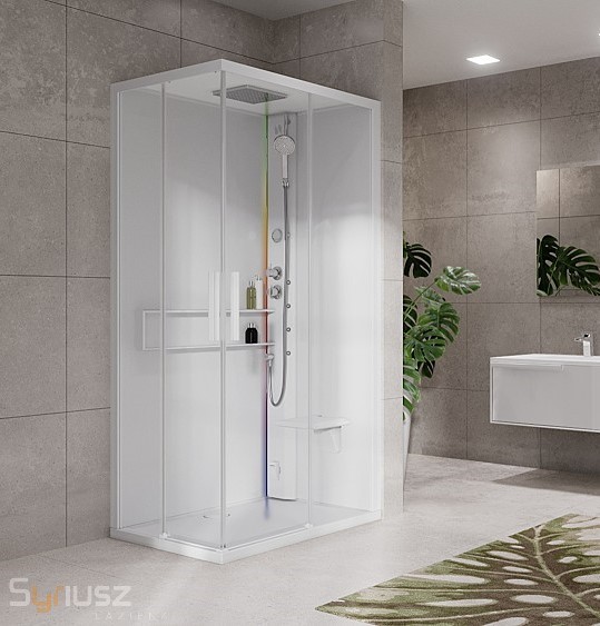 Multifunkcyjna czterościenna kabina parowa od włoskiej firmy Novellini o wymiarach 120 x 90 cm. Dostępna w pięciu kolorach do wyboru: biała, srebrna, czarna, beżowa oraz cała biała (widoczna na zdjęciu)