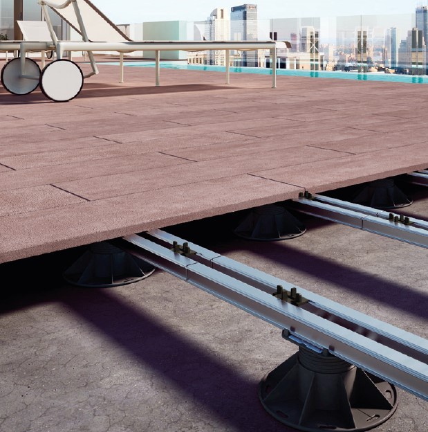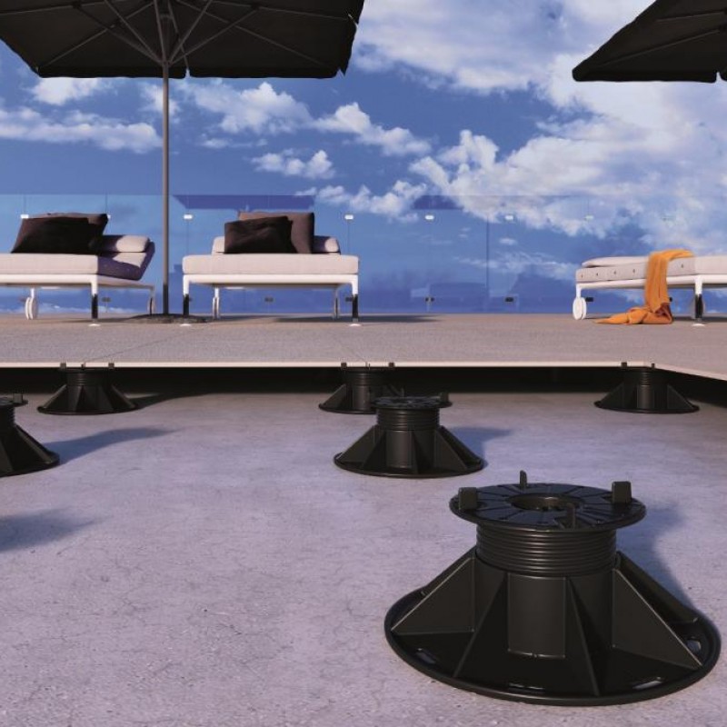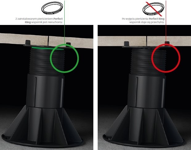 Po włożeniu go między głowicę i śrubę wspornik ulega unieruchomieniu. Jeśli zaistnieje potrzeba skompensowania nachylenia powierzchni do 6%, wystarczy nie instalować pierścienia w celu uzyskania systemu przechylnego. Oprócz uproszczenia pracy podczas instalacji PP Level Duo zastępuje podwójny zapas wsporników z głowicą stałą i przechylną.