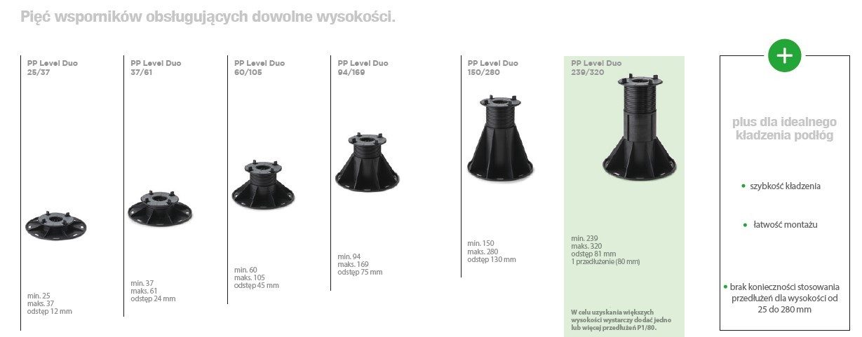 Wszystkie wsporniki PP Level Duo oferują regulowaną wysokość dzięki kluczowi umożliwiającemu regulację od góry. Klucz ten pozwala na korygowanie drobnych niedoskonałości oraz na kompensację dużych nachyleń, gwarantując idealny rezultat co do milimetra.